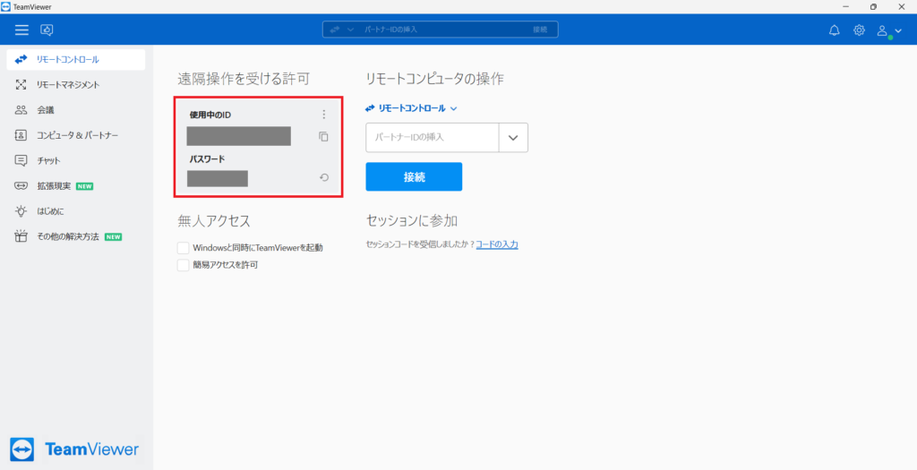 インストールが完了してTeamViewerを開くと、使用中のIDとPWが表示されます。