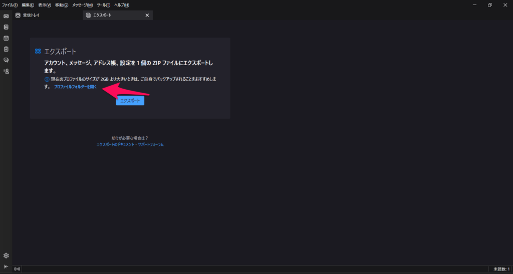 「エクスポート」と書かれたエリアにある「プロファイルフォルダーを開く」というリンクをクリックします。